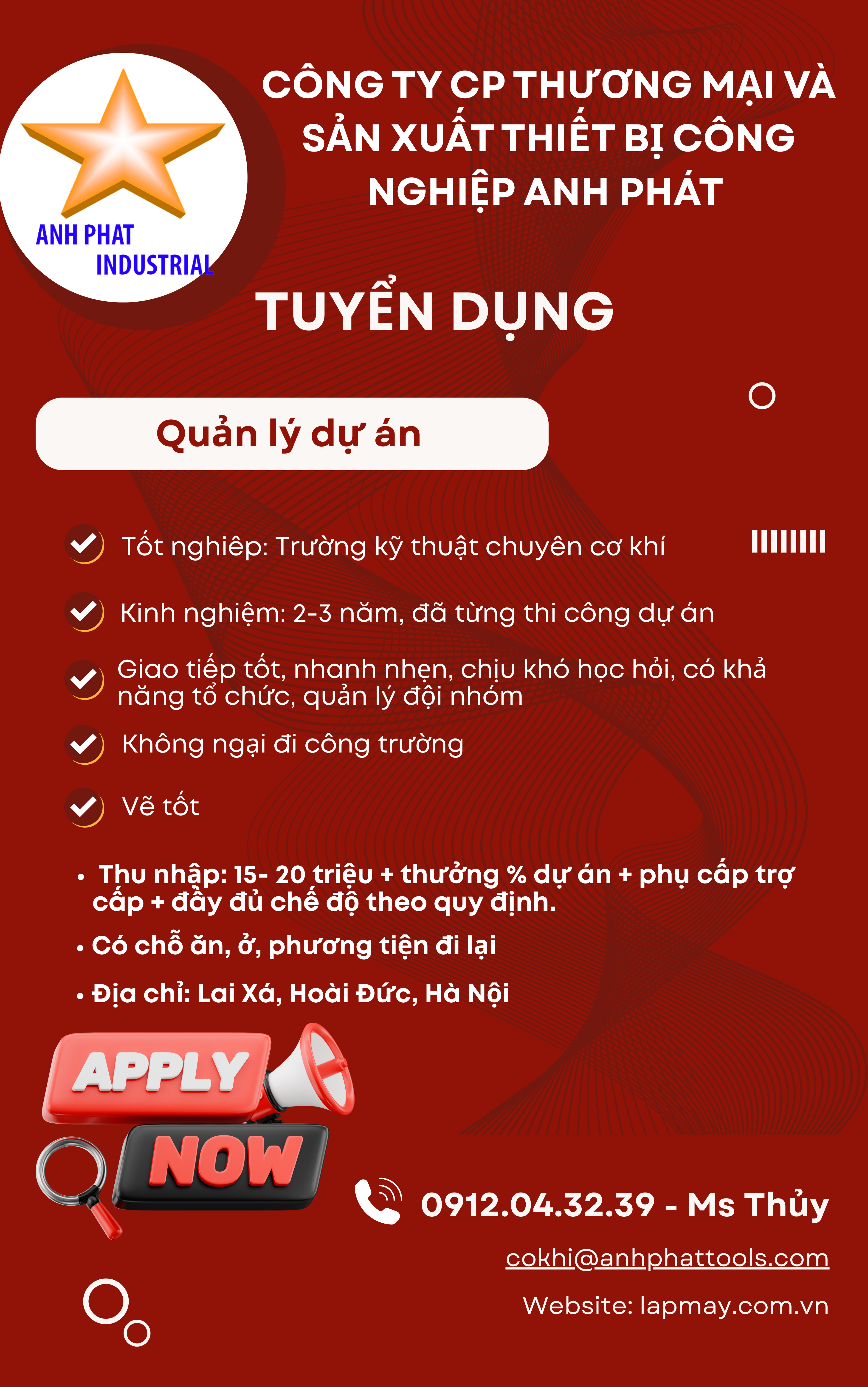 Nếu bạn thấy mình phù hợp với vị trí này và mong muốn trở thành một phần của Công ty Anh Phát, vui lòng liên hệ ngay để được sắp xếp phỏng vấn: